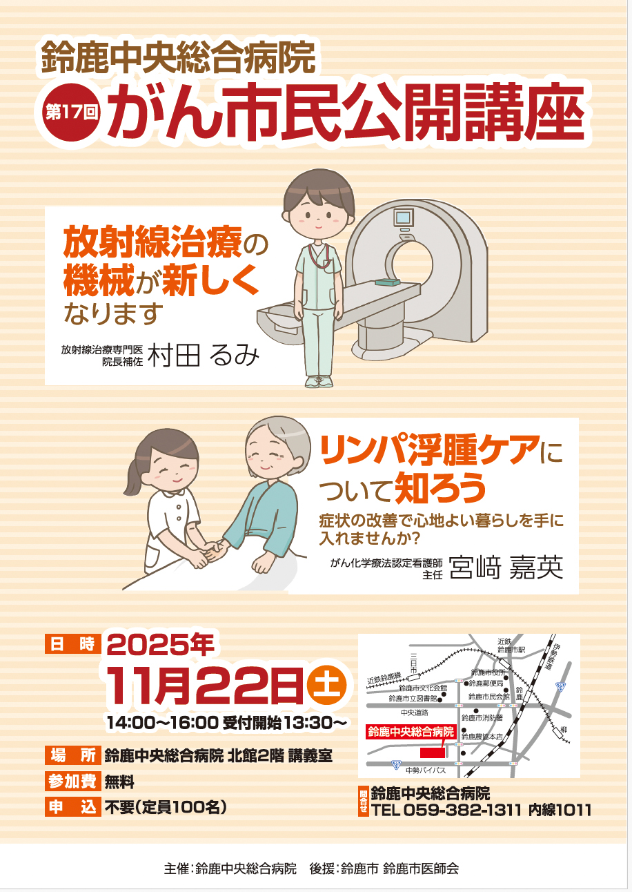 お知らせ 第17回がん市民公開講座を開催します 【第17回 がん市民公開講座】 内容:「放射線治療の機械が新しくなります」 「リンパ浮腫ケアについて知ろう ~症状の改善で心地よい暮らしを手に入れませんか?~」 日時:2025年11月22日(土)14:00~16:00 場所:鈴鹿中央総合病院 北館2階 講義室 入場料:無料 ※事前登録、整理券などはありません。当日お気軽に会場にお越しください。